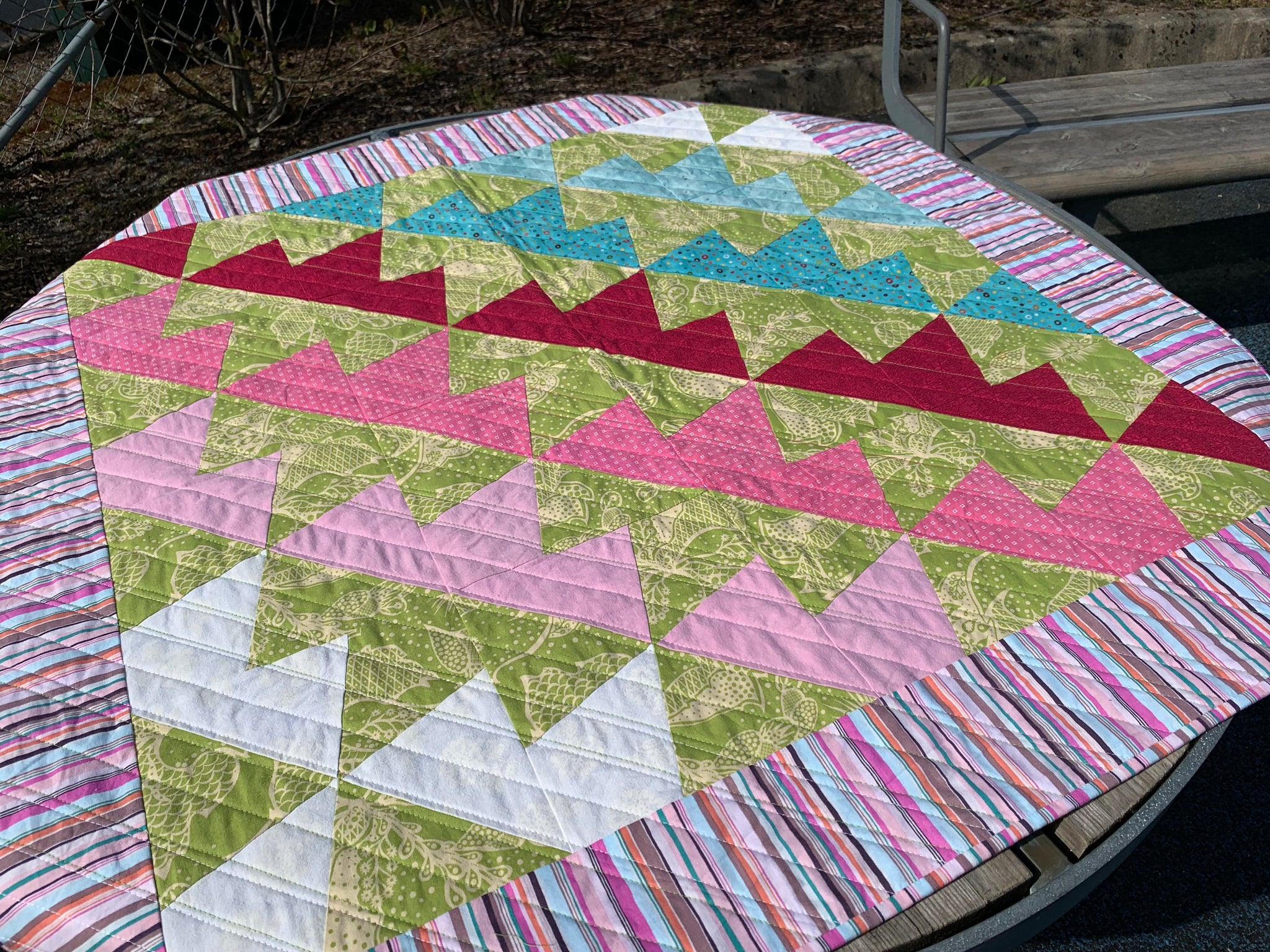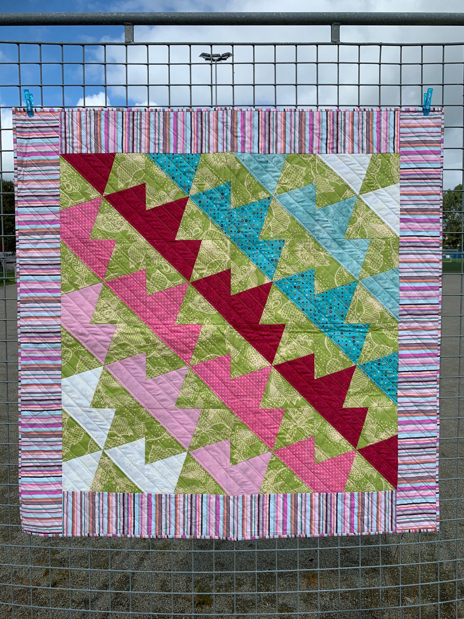 Quilten har en stilig, grafisk design. Alt du trenger er stoffrester i forskjellige farger + en bakgrunn, og en ramme. Man må jo bare elske å kunne bruke restehaugen til noe moderne og spennende!